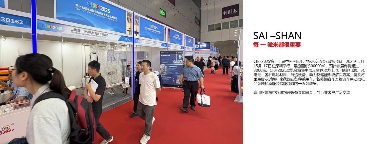 由中國化學與物理電源行業協會主辦的“第十七屆深圳國際電池技術交流會/展覽會”(CIBF2025)將于2025年5月15-17日在深圳國際會展中心隆重舉辦。本屆展會規模宏大,將設立15個展館,總面積近30萬平方米。預計將吸引超過3000家國內外展商參展,并迎來40多萬名來自全球的專業觀眾到場參觀洽談. 賽山粉體攜帶超微粉碎設備亮相展會,與客戶廣泛交流。